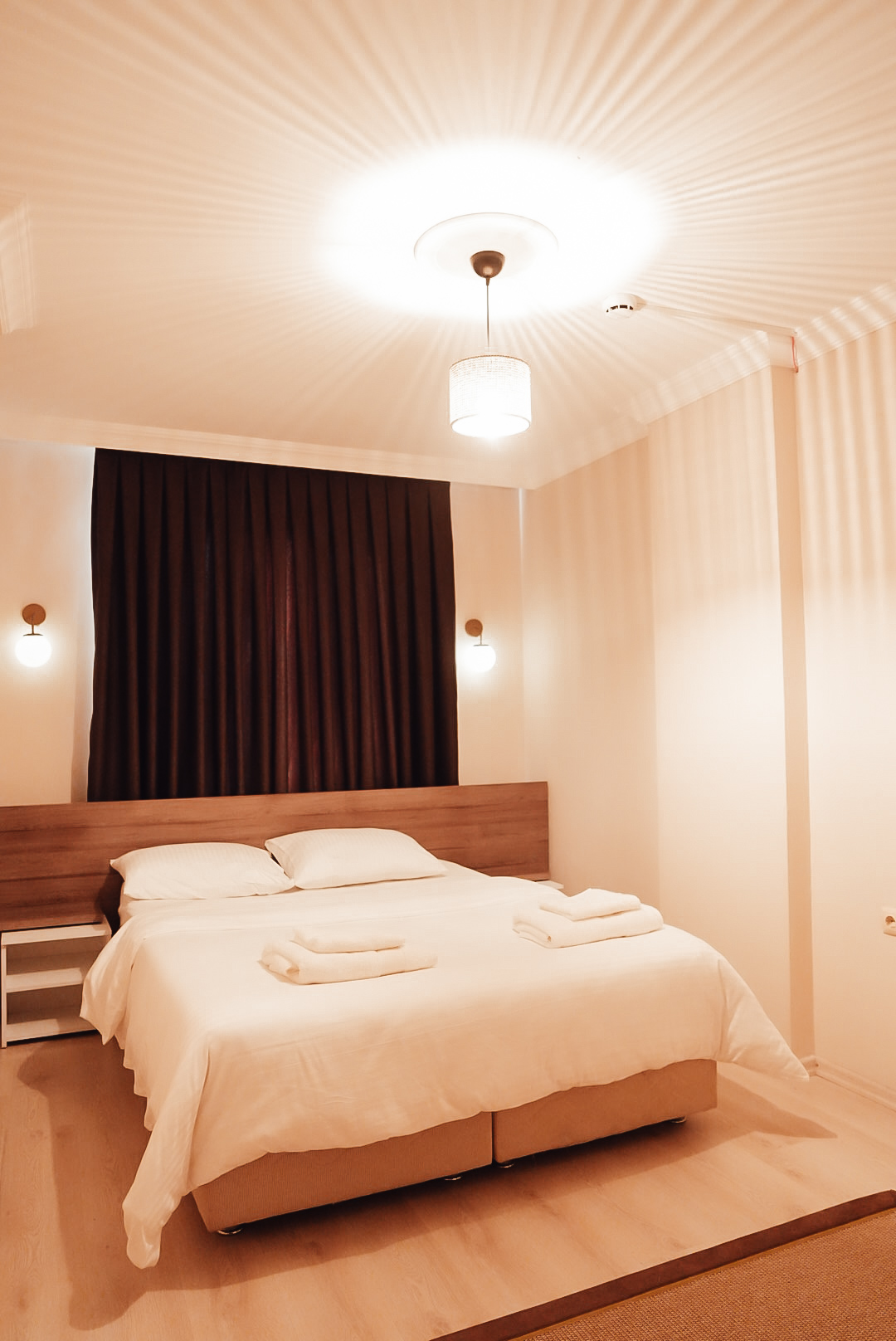 Süit dairelerimizde double yataklı yatak odası, tek kişilik yataklı yatak odası, salonda oturma grubu, Banyoyo-wc, Balkon bulunmaktadır.